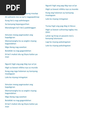 Higit sa lahat lyrics. HIGIT SA LAHAT MALAYANG PILIPINO Verse 1 D Fm G D Nagpapasalamat ang puso kong ito G Em G A Oh Diyos sa kabutihan at sa katapatan mo D Fm G D Di karapat-dapat ang isang katulad ko G Em G A. Higit Sa Lahat By Malayang Pilipino Chords lyrics. D Fm G A.