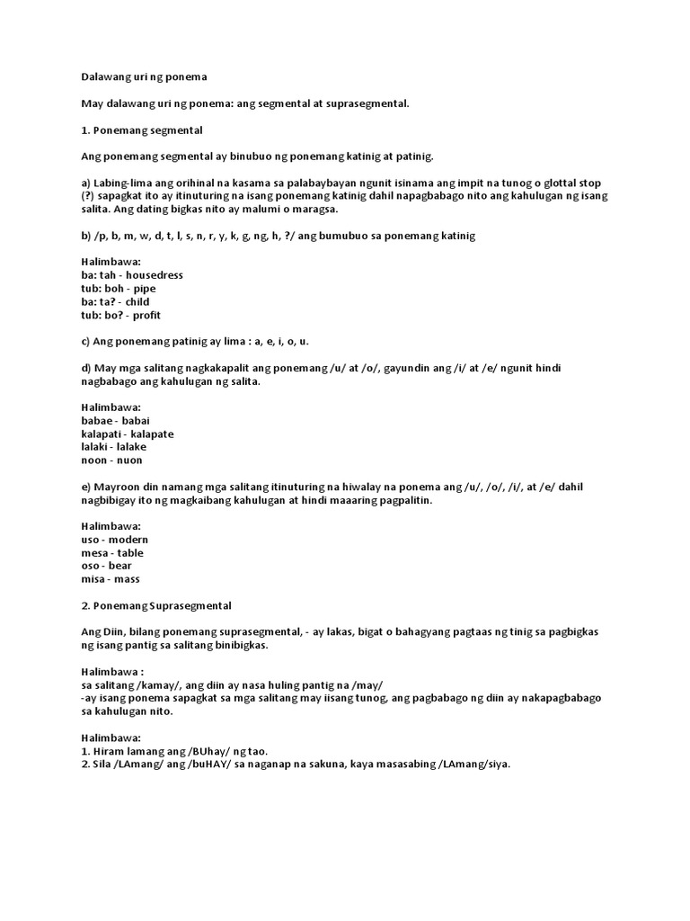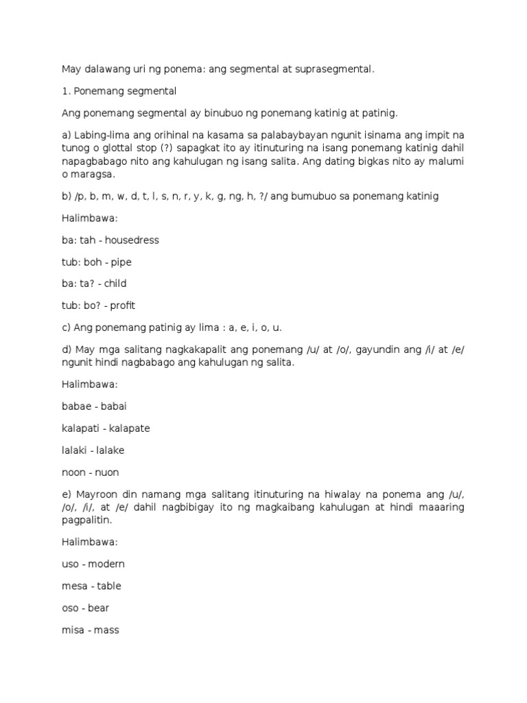 Ponemang Segmental Halimbawa ng pares minimal Gawain kaya- can do kaya- therefore baka- cow baka- might mama-mother mama- stranger pito-whistle pito- seven 1. Ang letrang F halimbawa. Haba ito ay ang pagbigkas nang mahaba sa patinig a e i o u ng bawatpantig maaaring gumamit ng simbolong tuldok.
