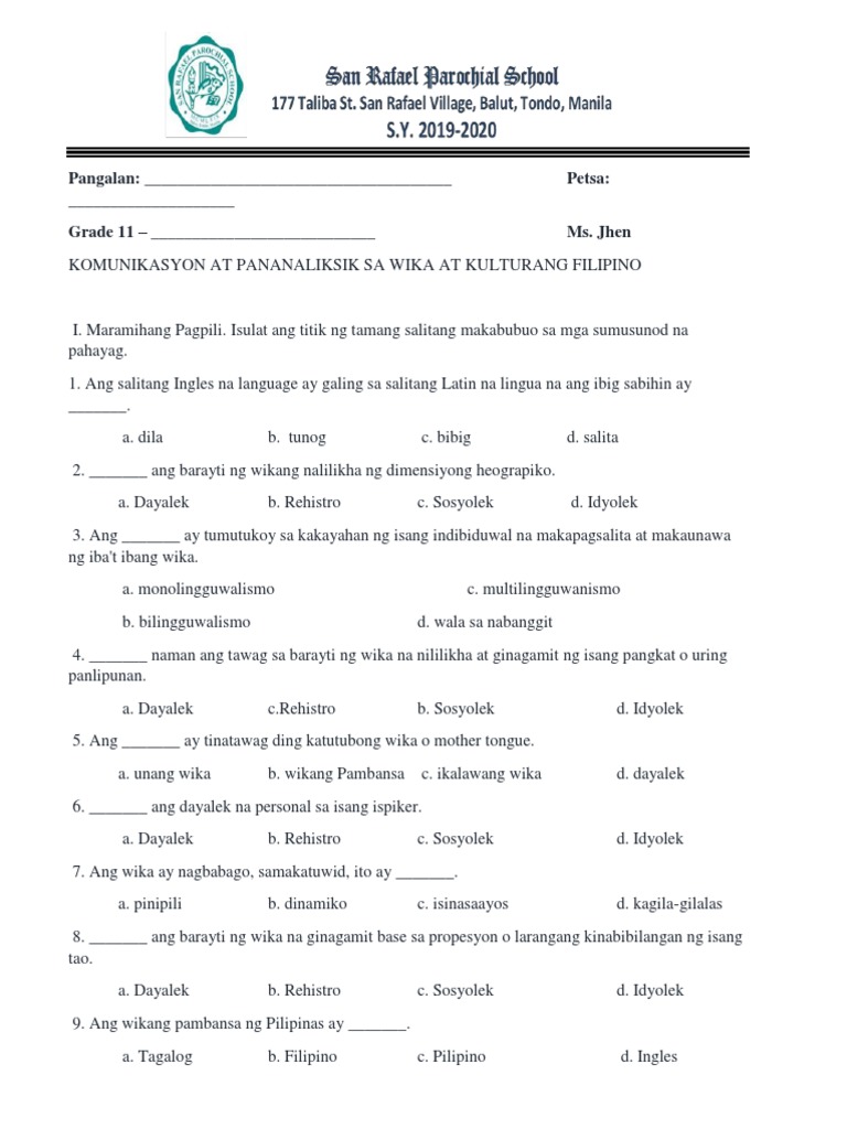 Filipino 1 28102019 2029 11. Ang salitang Latin ay isang beses lang lumitaw sa Bibliya sa Ju 1920 kung saan binanggit na ang inskripsiyon sa bandang itaas ng pahirapang tulos ni Jesus ay nakasulat sa Hebreo Latin at Griego. Wika ay isang kasangkapan sa pamamagitan ng isang tao sa isang lipunan ay maaaring makipag-usap sa bawat isa at ipahayag ang kanilang damdamin ng kaligayahan at galit sa anyo ng mga salita.