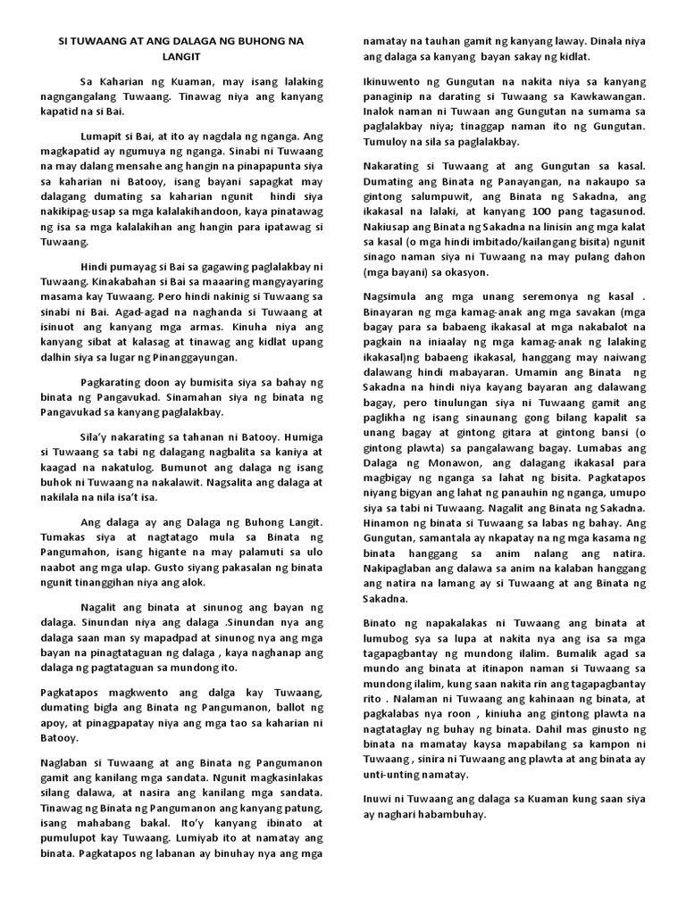 November 16 2013. See Page 1. Si Tuwaang na pangunahing tauhan sa Ang Tuwaang na kilalang epiko ng mga Bagobo o ang mga tao na naninirahan sa dulong bahagi ng Cotabato Bukidnon at Davao ay isang uri ng puno na kung tawagin nila ay kuaman.