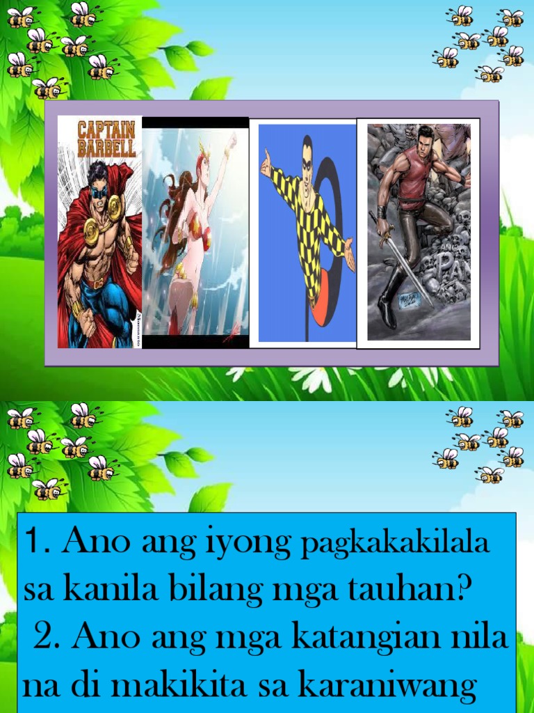 Gamit ang mga anda ng epiko magbigay ng mga pangyayaring kumakatawan dito mula sa Epiko ng Bagobo Tuwaang at ang Dalaga ng Buhong na Langit pasalitang paraan 2. Isang araw tumanggap si Tuwaang ng balita na may isang dilag na nagmula sa kalangitan ng Buhong na nakarating sa kaharian ni Batooy upang humingi ng tulong. Suriin mong mabuti ang pangunahing tauhan.