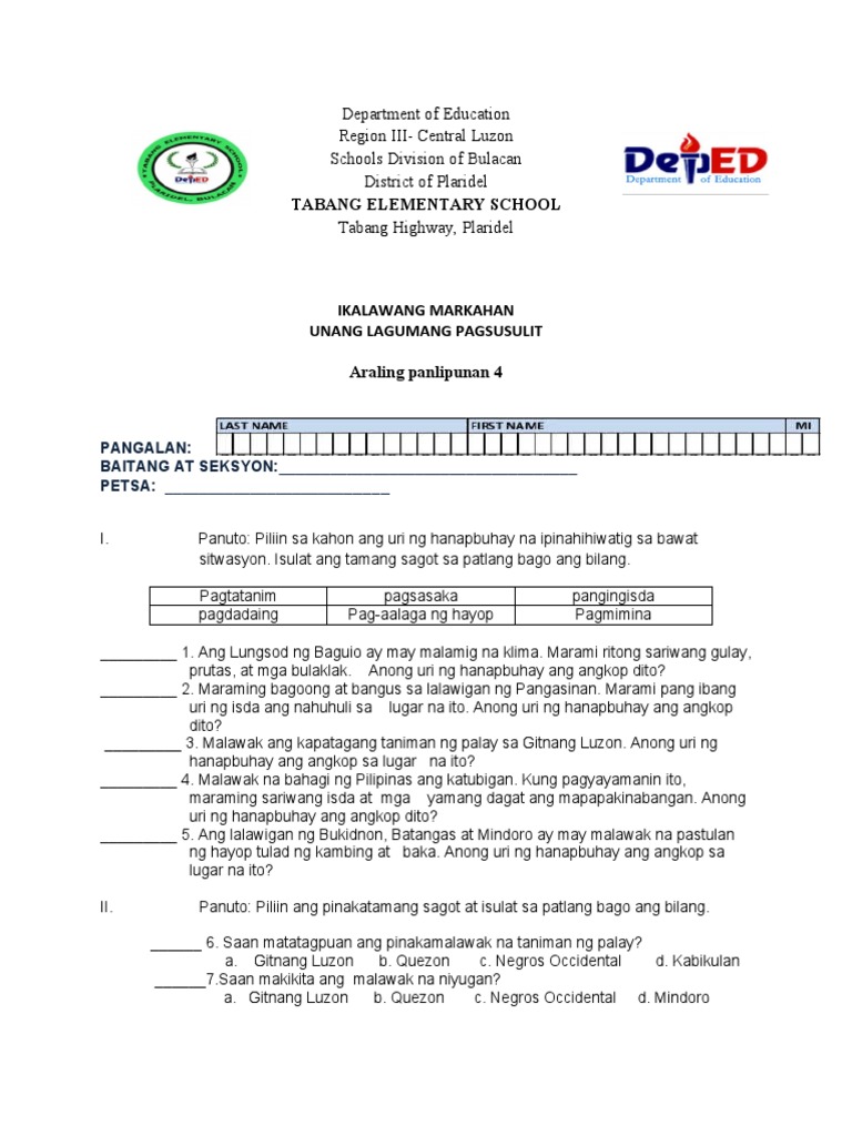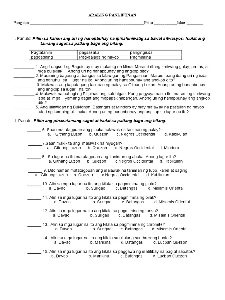 View Test Prep - Araling Panlipunan 4 Sum Testdocx from BUSINESS 125 at London School of Science and Technology. Saging ang pangunahing produktong agrikultura ng rehiyon4. Piliin ang pinakatamang sagot at isulat sa patlang bago ang bilang.