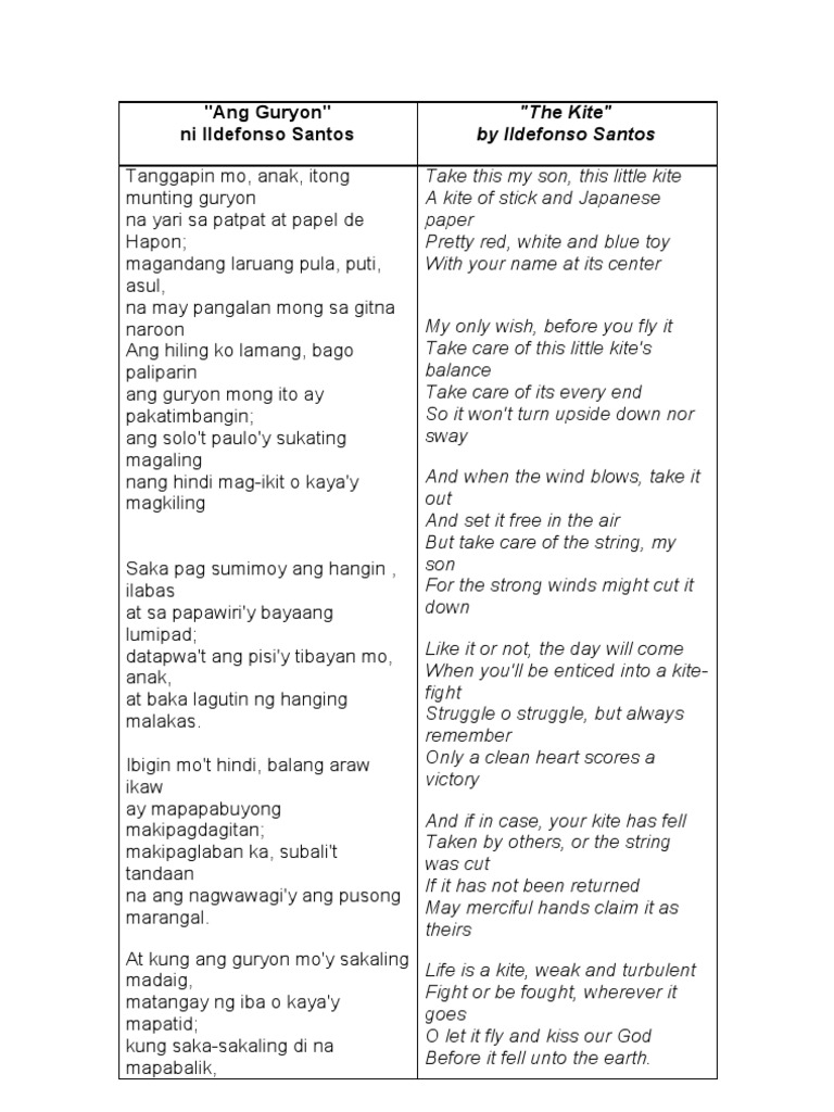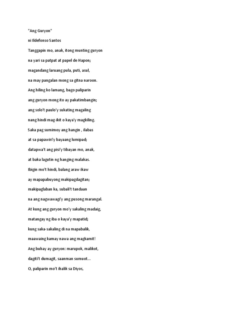Tanggapin mo anak itong munting guryon na yari sa patpat at papel de Hapon. This poem was written by Ildefonso Santos. Ang solot pauloy sukating magaling.