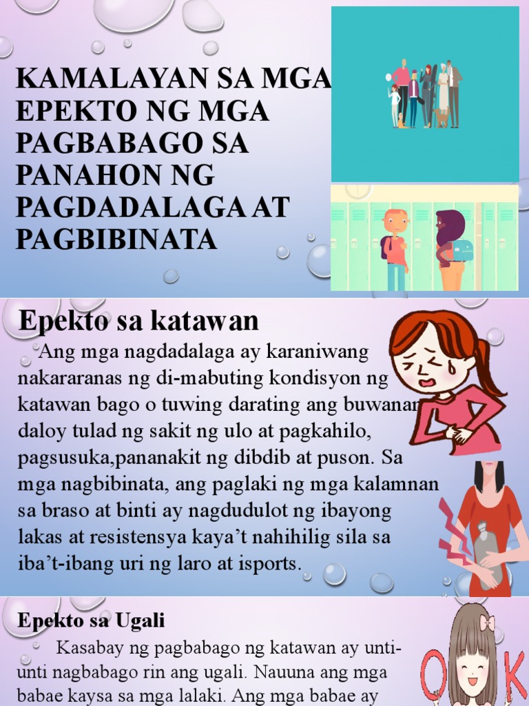 EPEKTO NG MGA PAGBABAGO SA PANAHON NG PAGDADALAGA AT PAGBIBINATA Epekto sa katawan Ang mga nagdadalaga ay karaniwang nakararanas ng di-mabuting kondisyon ng katawan bago o tuwing darating ang buwanang daloy tulad ng sakit ng. Malawak ang saklaw ng normal na pagbibinata o pagdadalaga ang sabi ng aklat na Letting Go With Love and Confidence. Grade 5 HealthQuarter 2Episode 2.