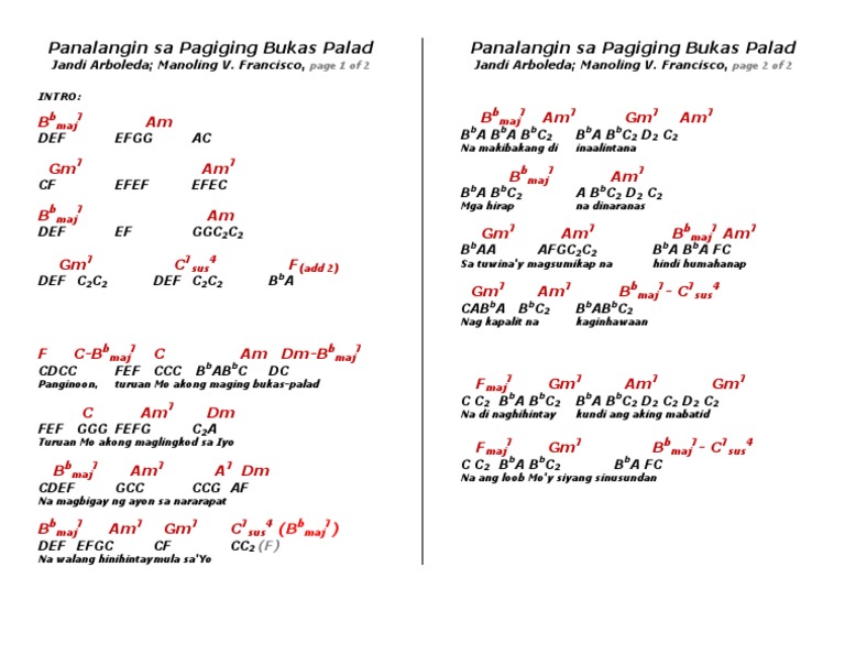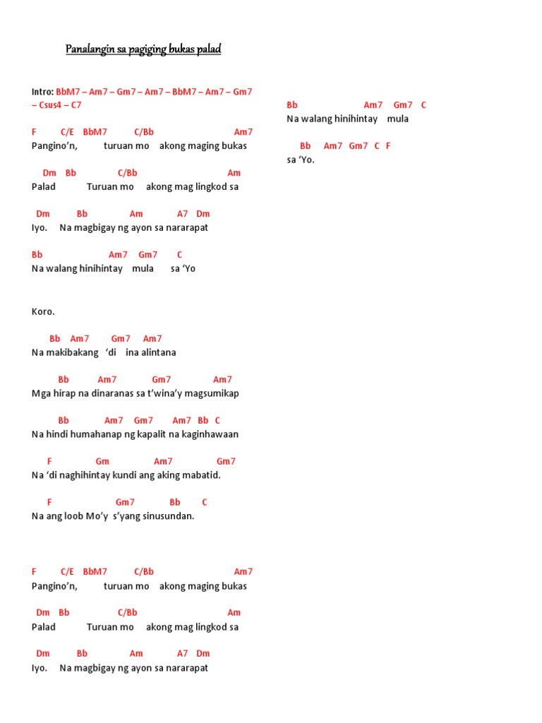 Panalangin sa Pagiging Bukas Palad Lyrics. BbM7 CBb Am7 Dm7 Turuan Mo akong maglingkod sa Iyo BbM7 Am7 A7 Dm7 Na magbigay ng ayon sa nararapat BbM7 Am7 Gm7 C7sus C7 Na walang hihintay mula. Bukas Palad Music MinistryPanginoon turuan Mo a.